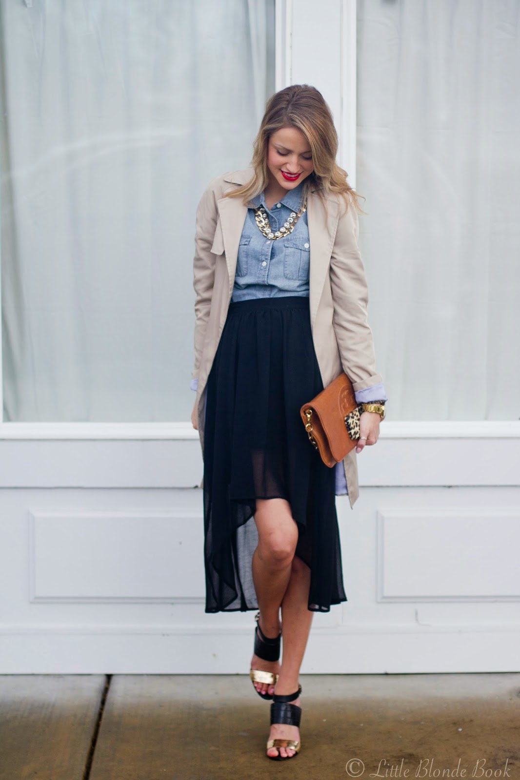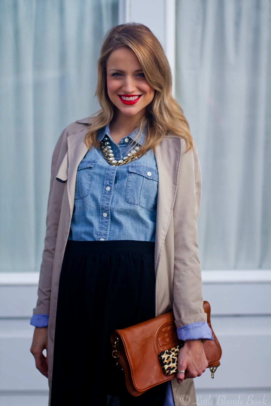 Top:J.Crew | Skirt:Old, Similar here | Trench Coat:Zara, old similar here | Heels:Elizabeth and James | Clutch:Tory Burch | Tech Case:J.Crew | Lip:M.A.C Lady Danger | Watch:Michael Kors | Necklaces:J.Crew , similar chain |