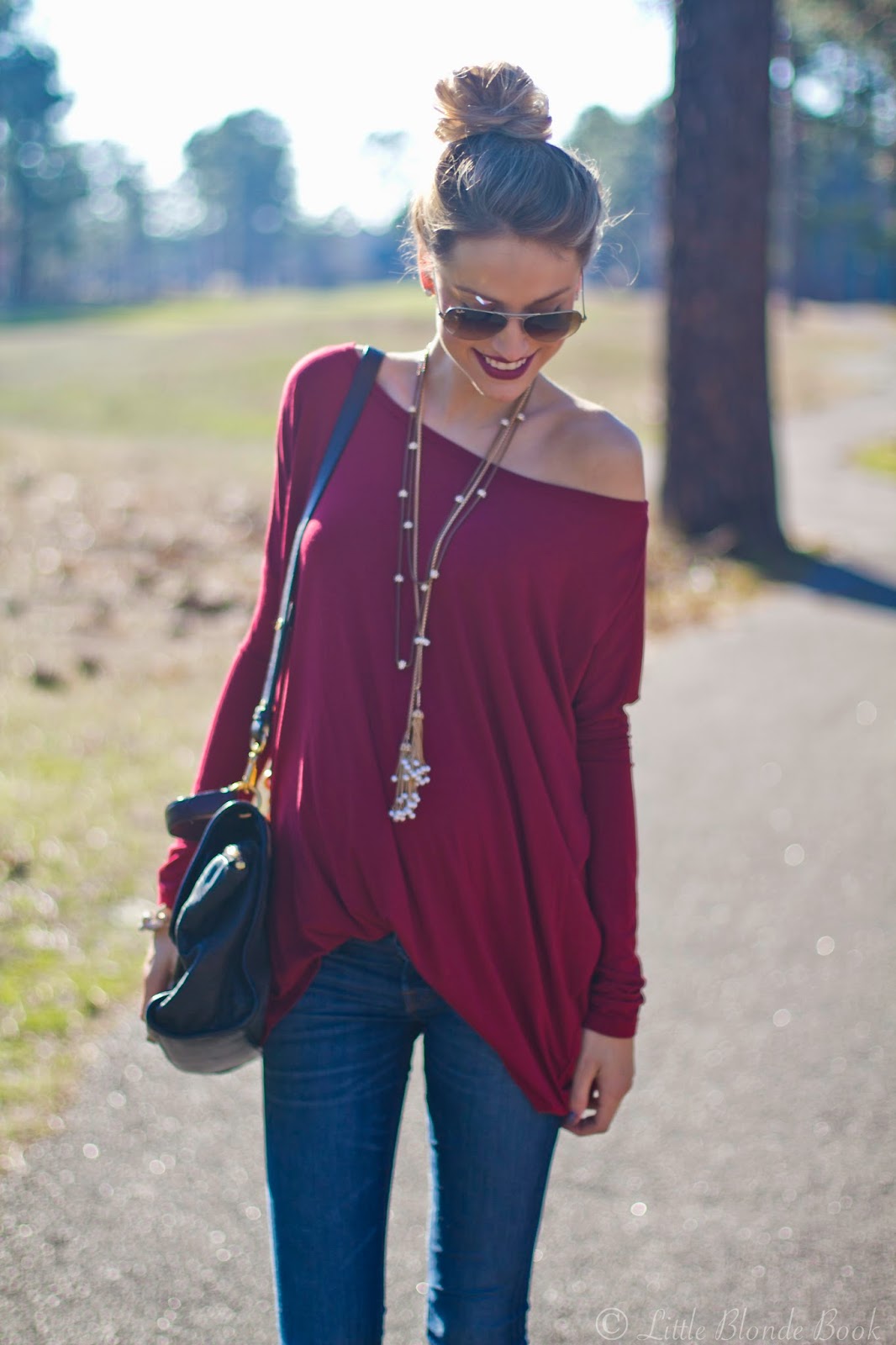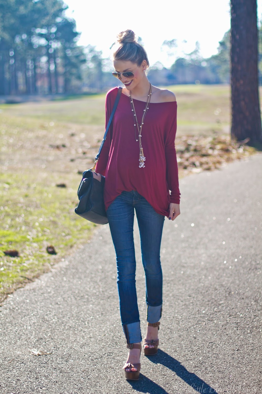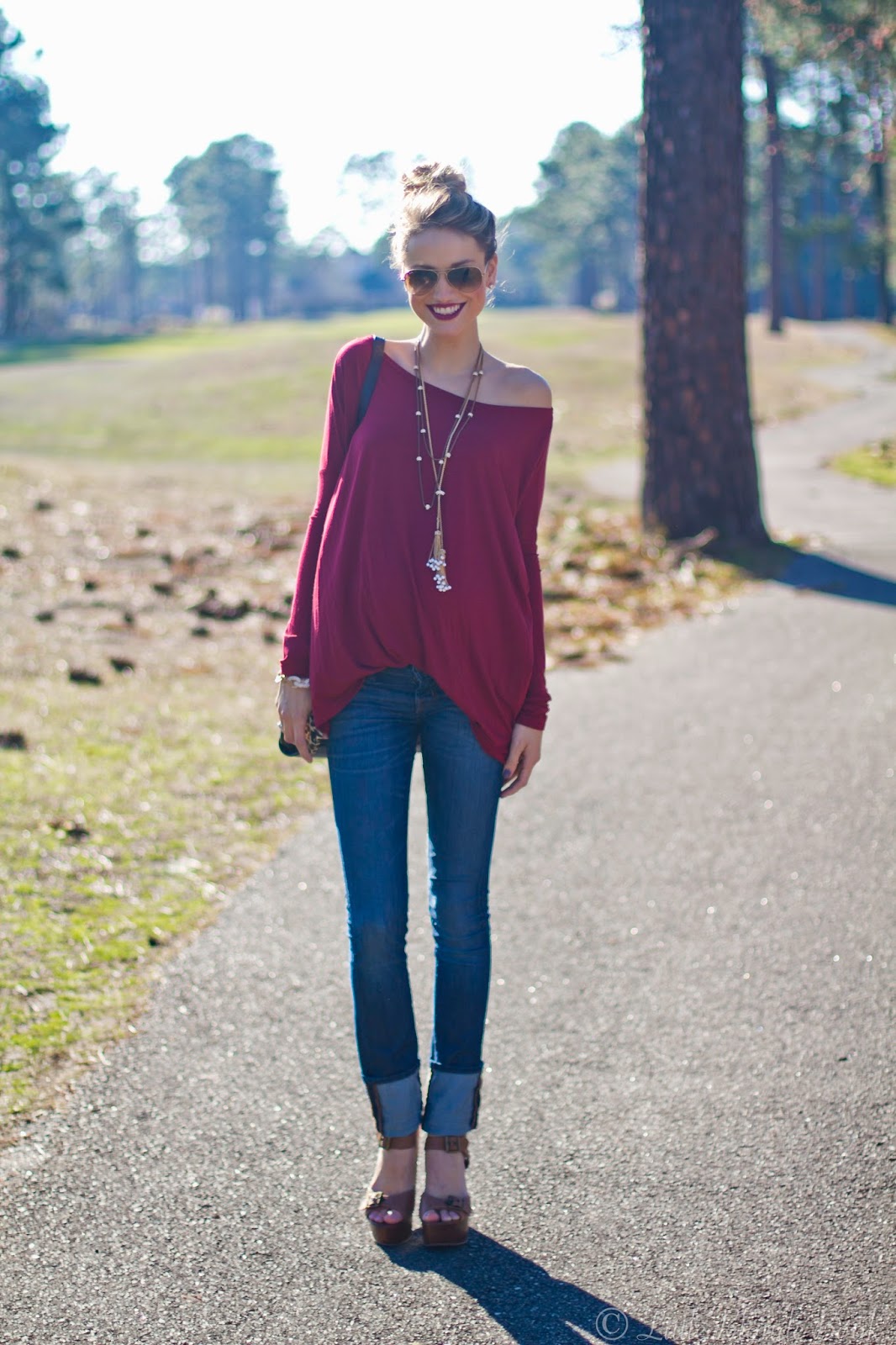 Top: via Shop RiffRaff c/0 | Denim: J Brand On Sale! | Wedges: Steve Madden | Necklace: Anthropologie, Tassel via Armed and Readi c/0 | Sunnies: Ray Ban | Lips: MAC, Rebel