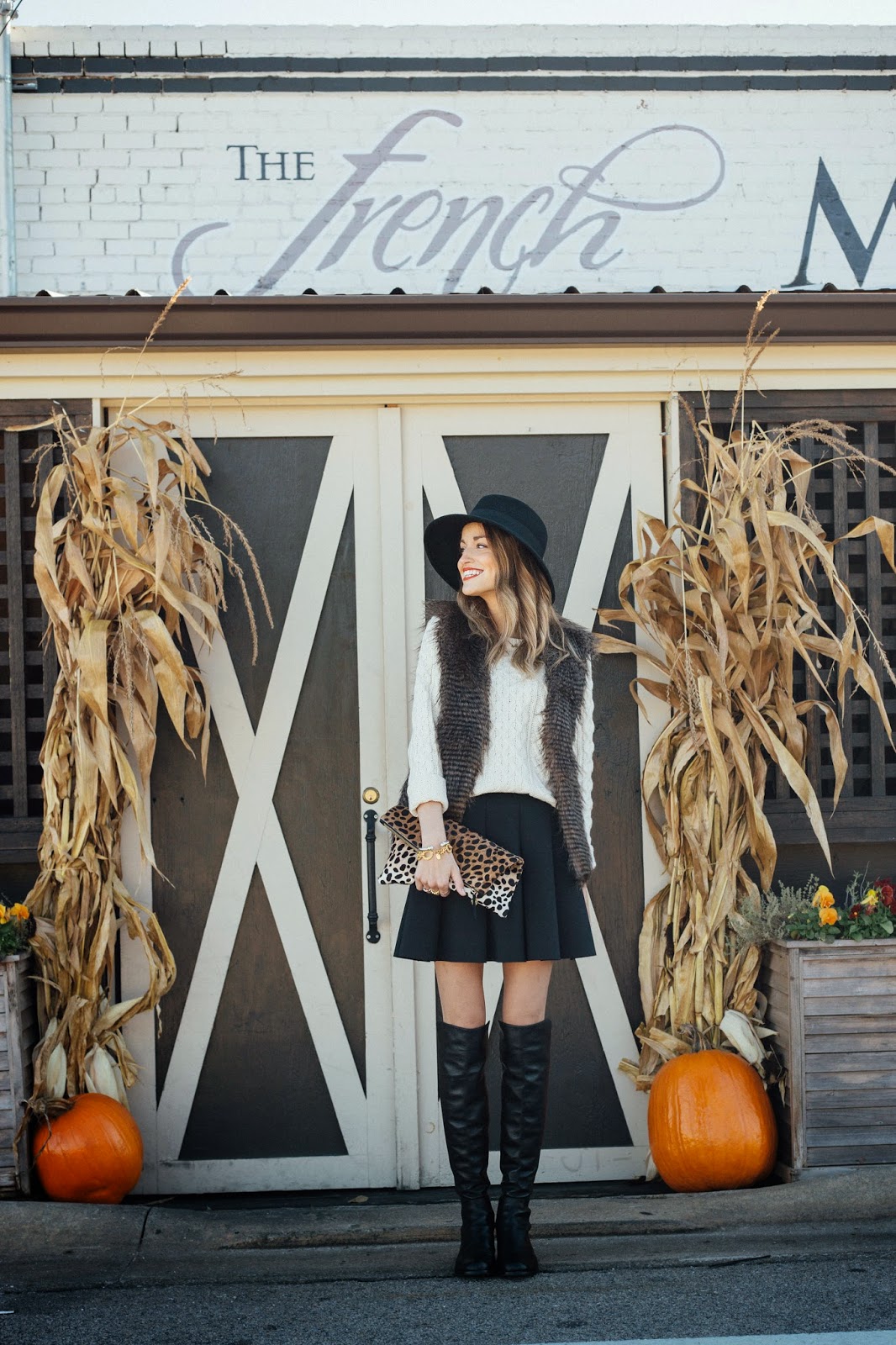 Piperlime Cable Knit Sweater | Nordstrom Faux Fur Vest | Topshop Skirt | Stuart Weitzman 5050 Boots 25% off! | Clare Vivier Leopard Clutch | Eric Javits Hat | MAC lip in “Lady Danger” | Julie Vos Isabella bracelet c/o | David Yurman Cable Cuff | Julie Vos stackable rings c/o | Arm Candy Fashion personalized necklace c/o