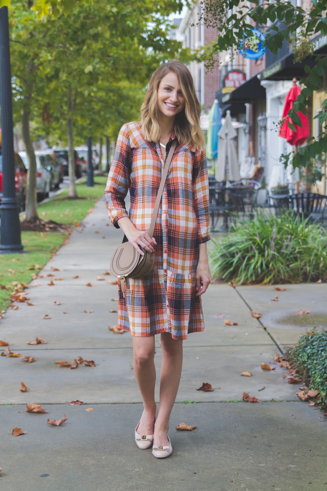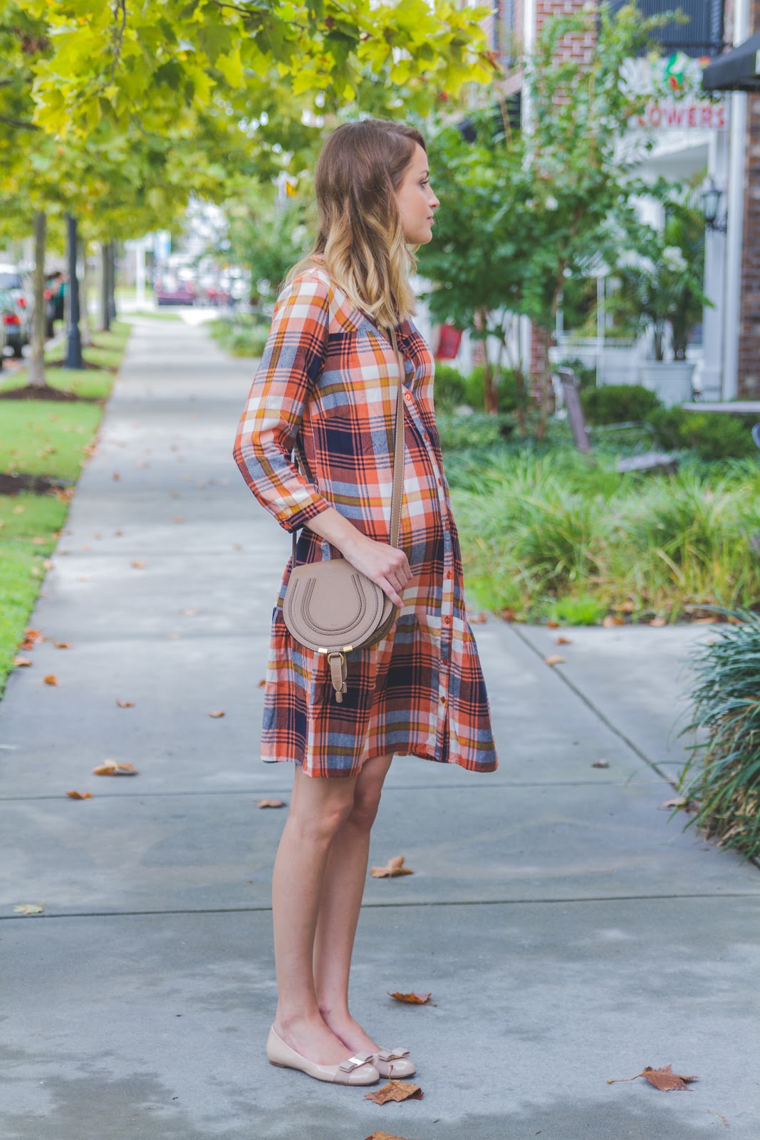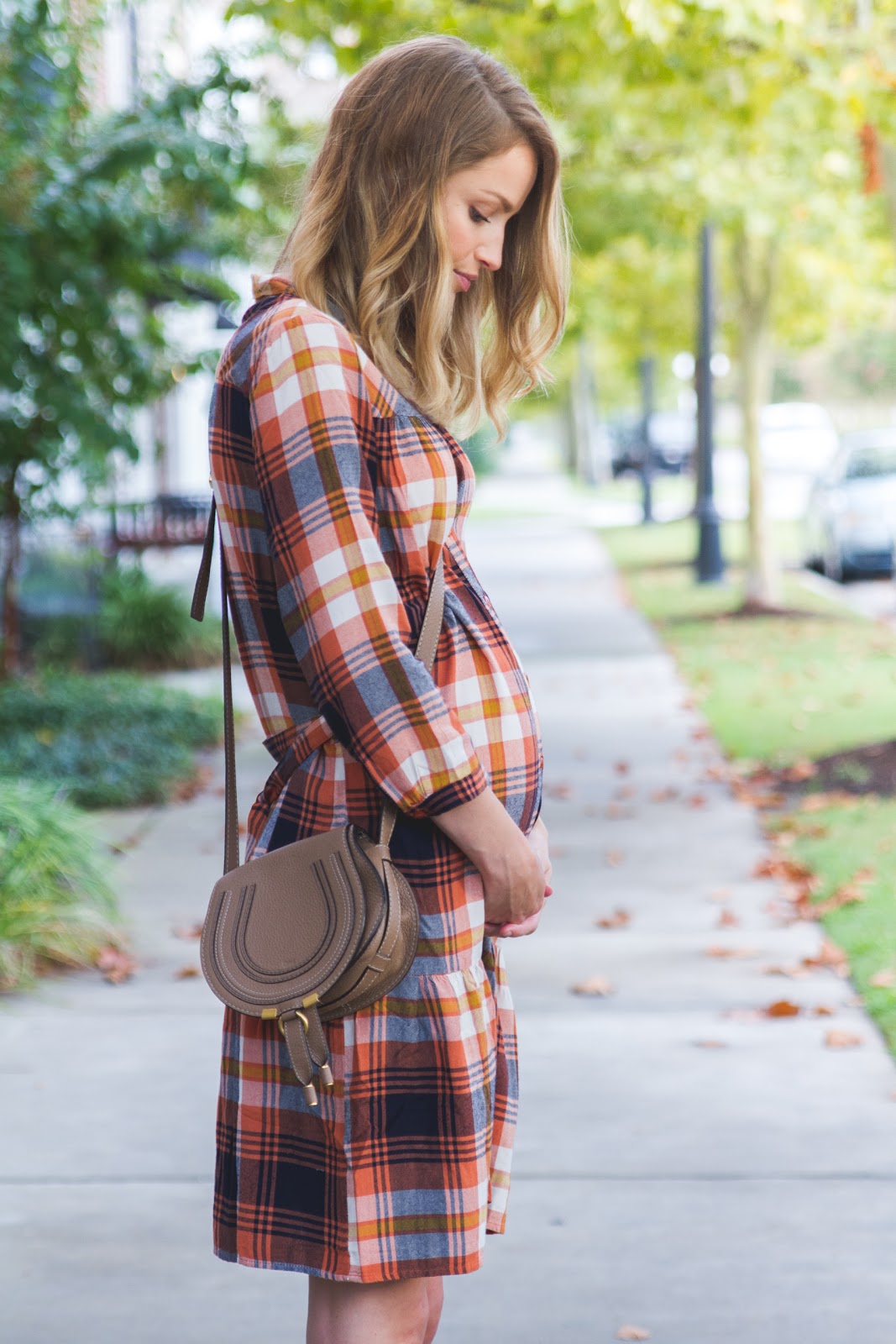 I love that these photos look so much like Fall with the leaves, lighting, and my dress (that I won’t be able to wear much longer!) You can totally tell my belly was trying hard to pop out of the middle buttons. This dress comes with a tie around the waist, but I opted for more of a loose fit, obviously, and tied the excess fabric in the back! Sometimes you’ve got to get a little crafty…