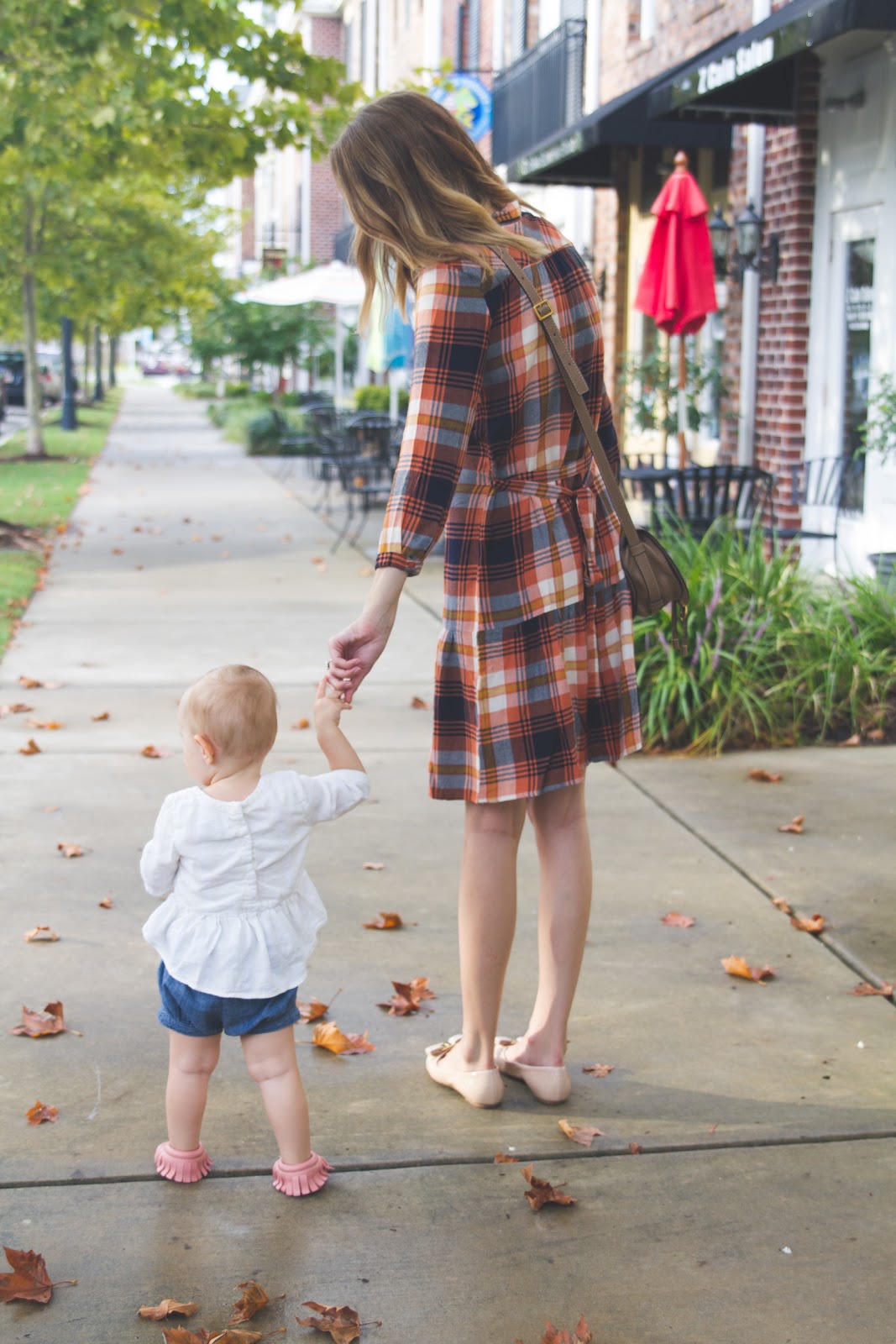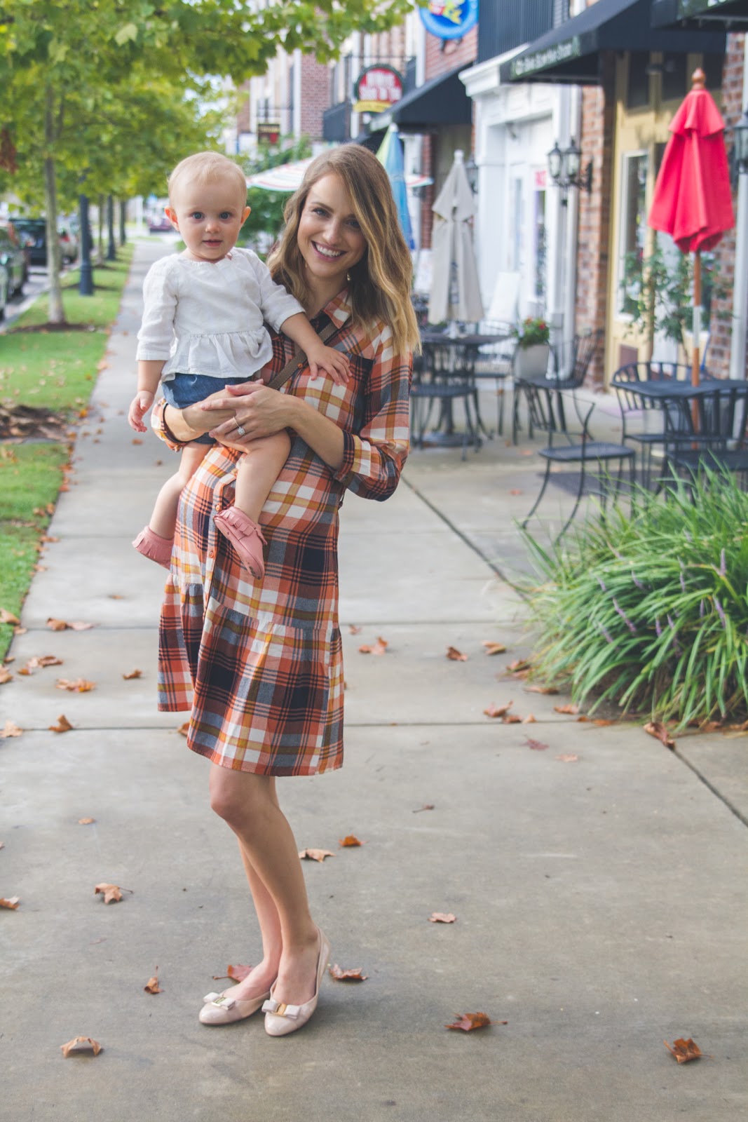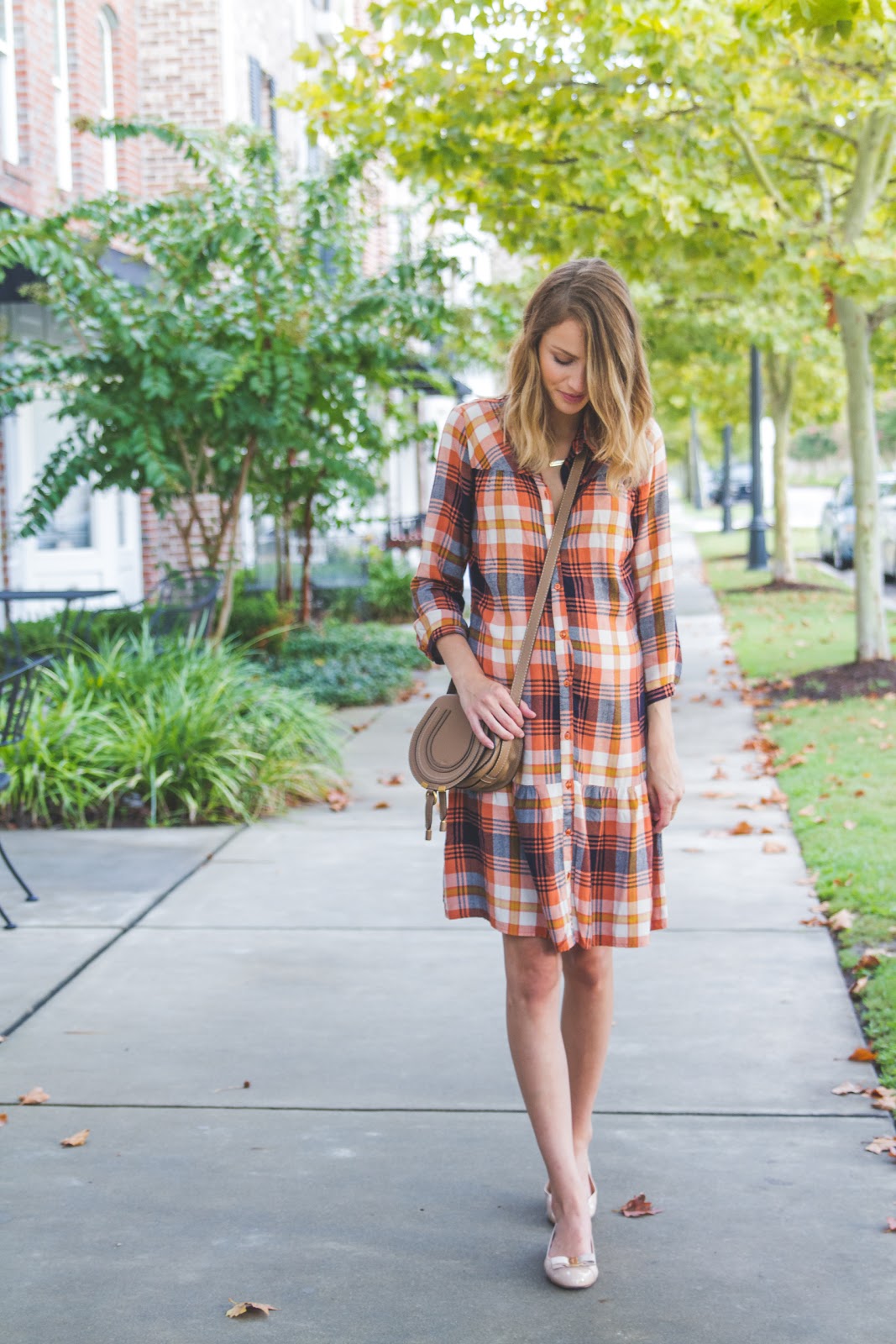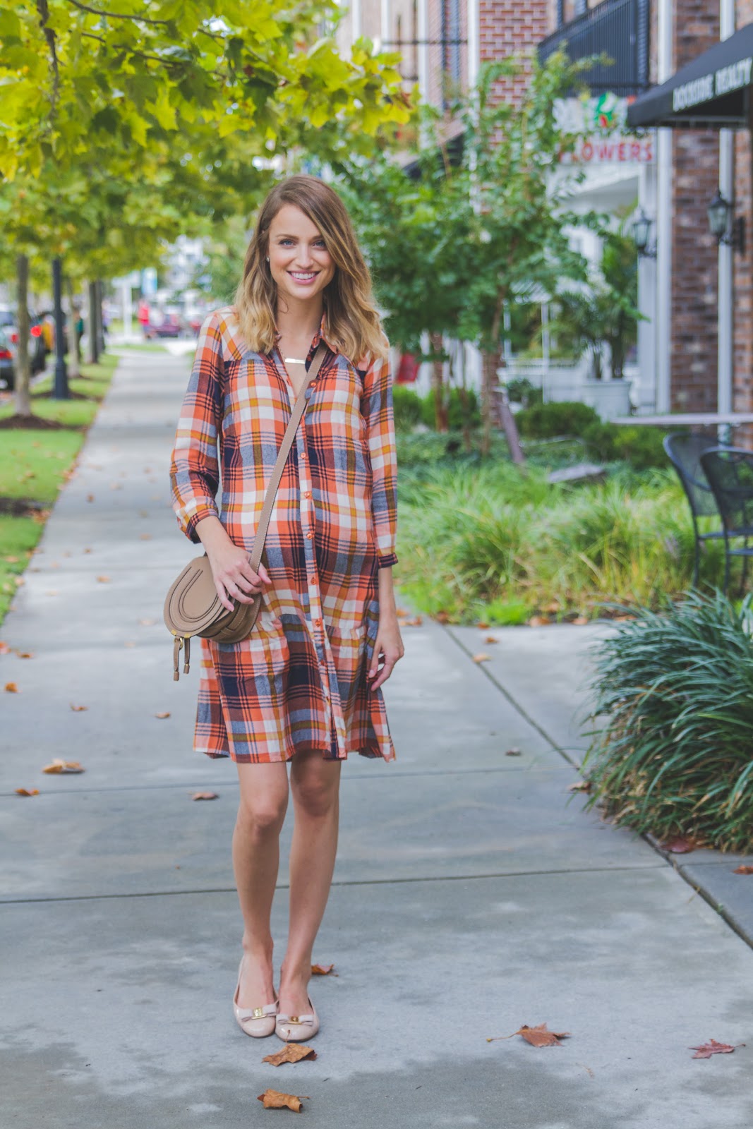I love that these photos look so much like Fall with the leaves, lighting, and my dress (that I won’t be able to wear much longer!) You can totally tell my belly was trying hard to pop out of the middle buttons. This dress comes with a tie around the waist, but I opted for more of a loose fit, obviously, and tied the excess fabric in the back! Sometimes you’ve got to get a little crafty…