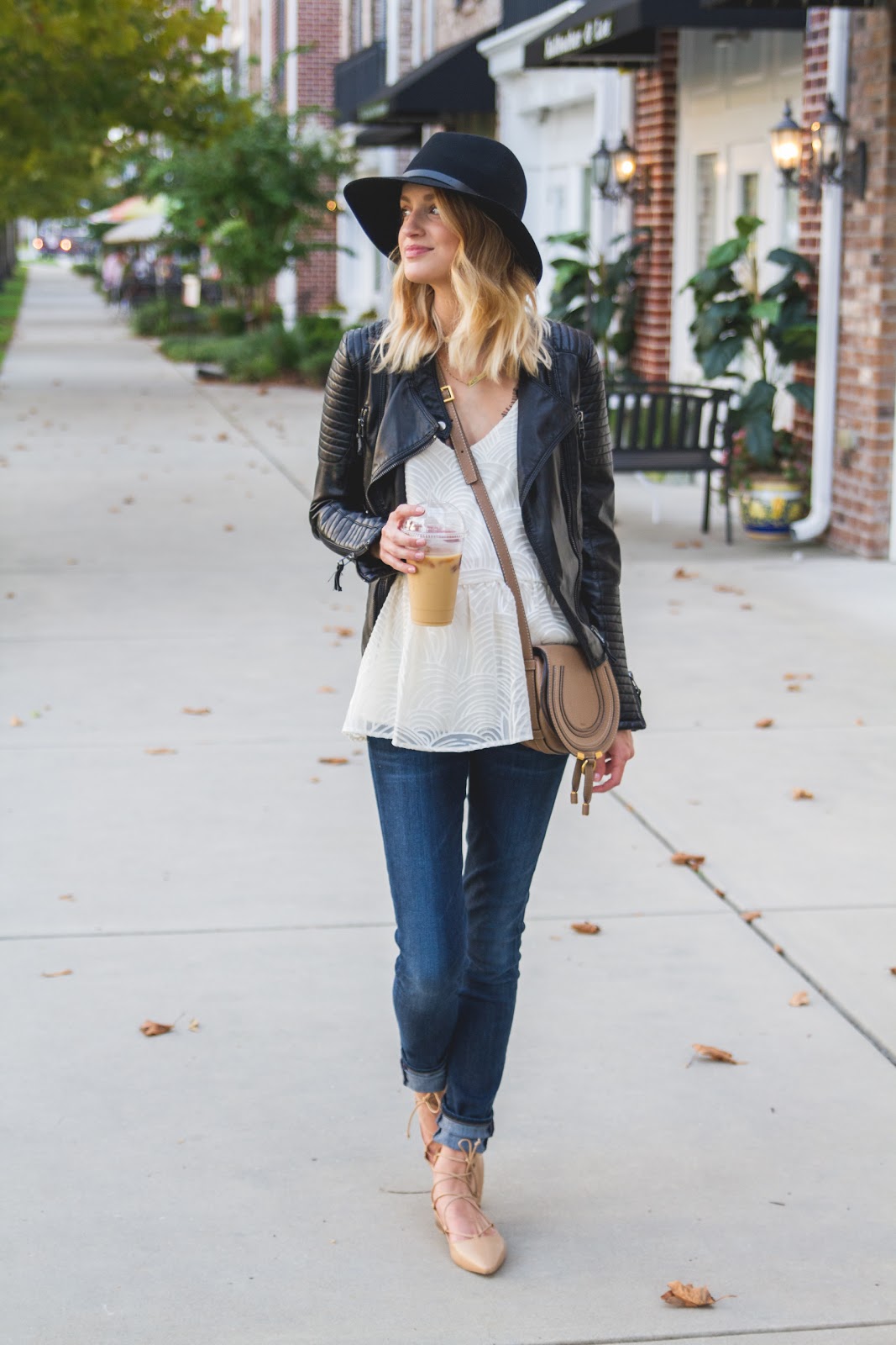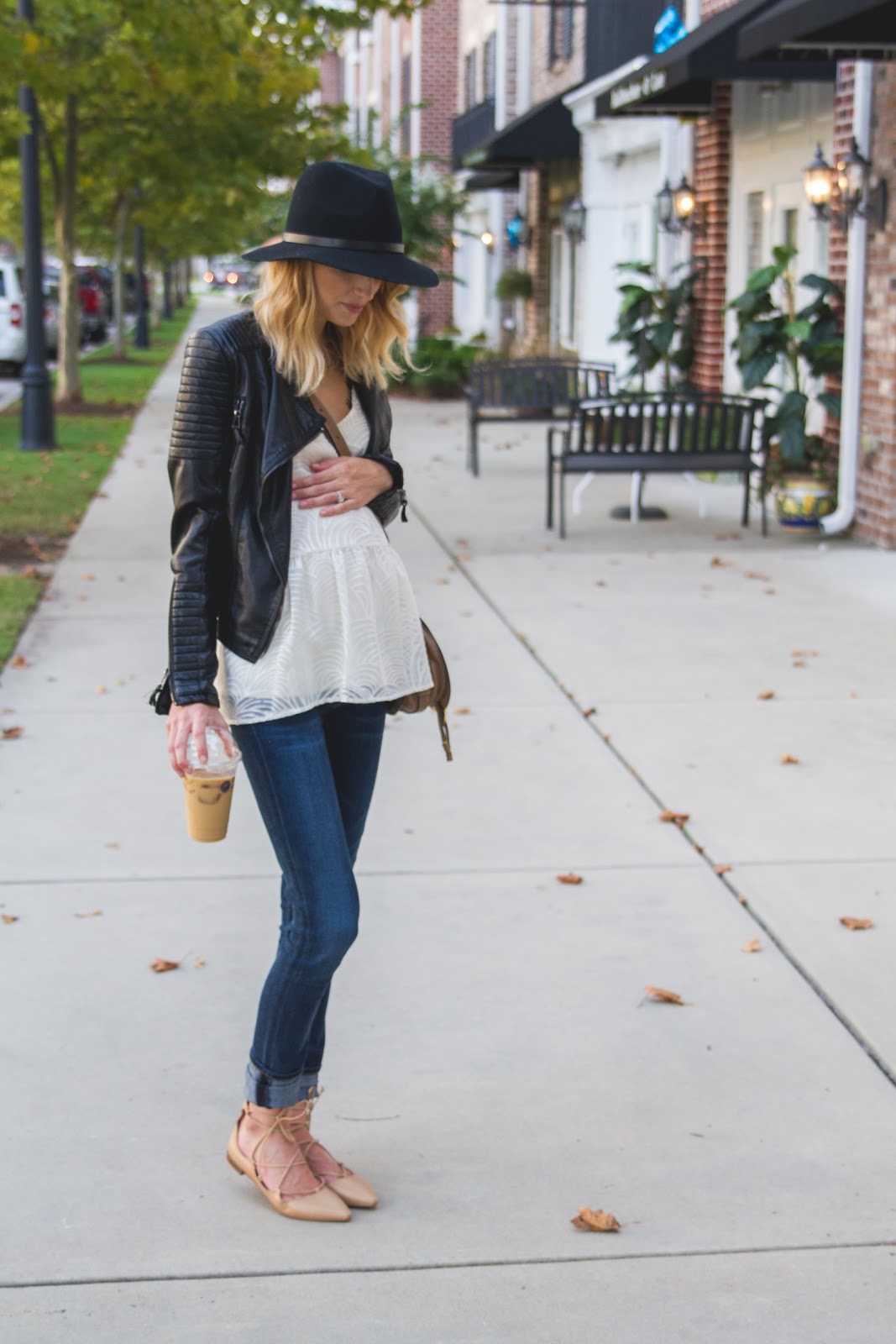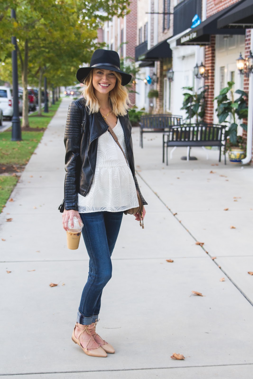 Leather Jacket is old, similar style splurge here and save here | Anthropologie Top (extra 30% off!) | Black lace bra | Citizens of Humanity maternity denim | Zara flats (hurt like hell, don’t buy them) similar styles here (only $45) and here | Rag & Bone Hat | Chloe Marcie Cross Body