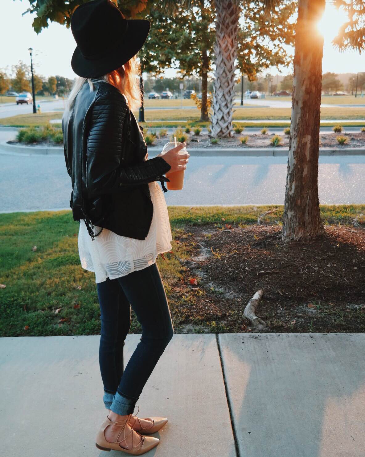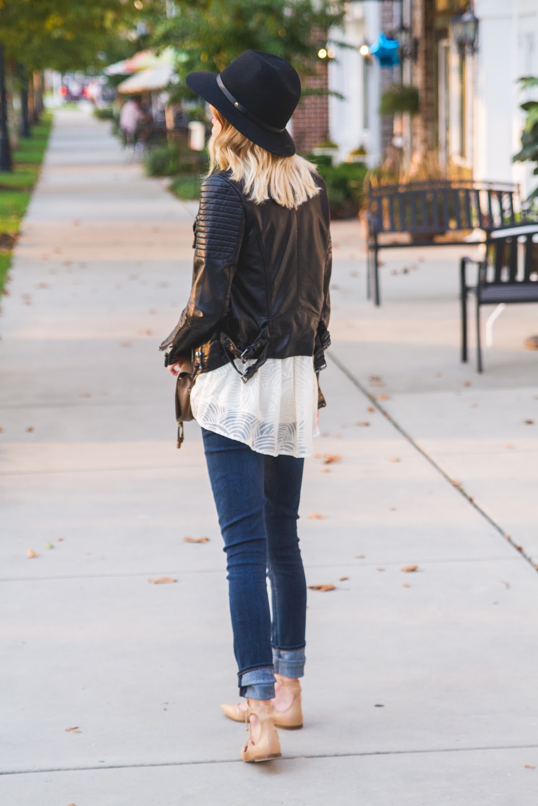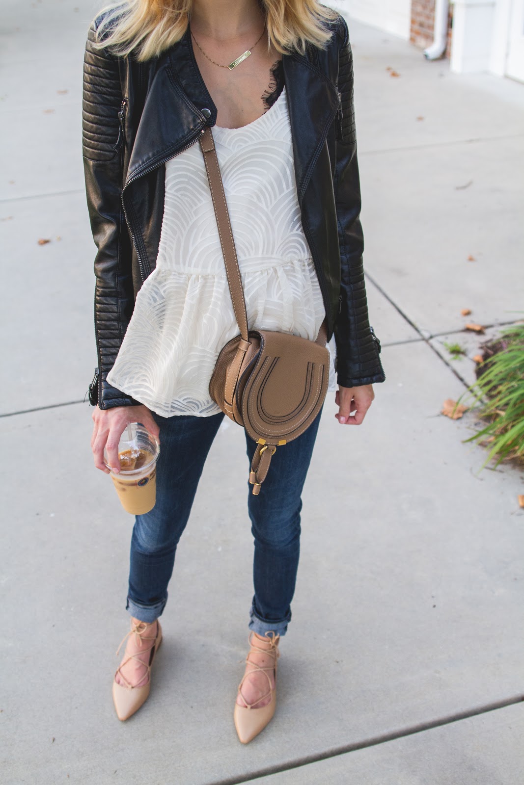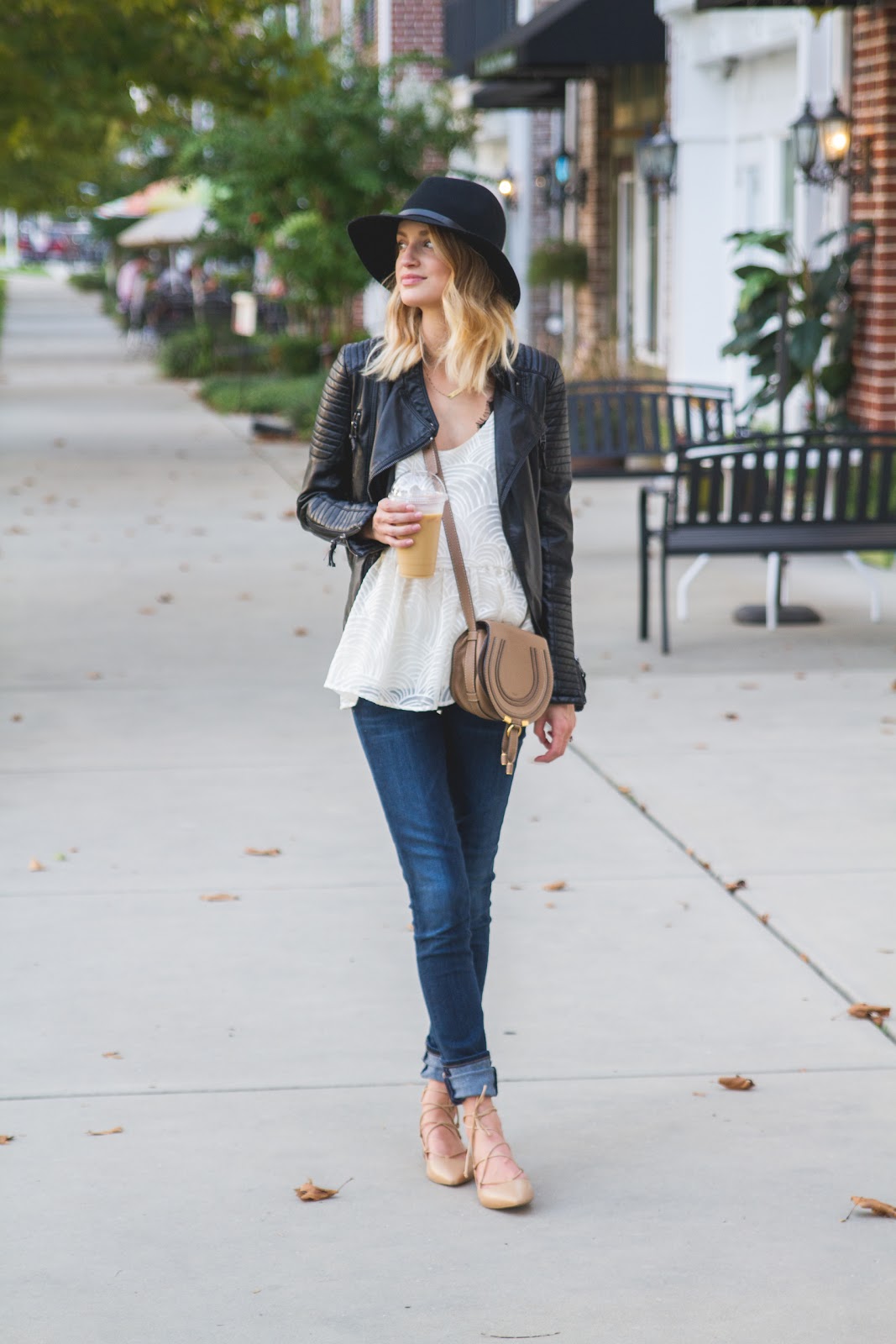 Leather Jacket is old, similar style splurge here and save here | Anthropologie Top (extra 30% off!) | Black lace bra | Citizens of Humanity maternity denim | Zara flats (hurt like hell, don’t buy them) similar styles here (only $45) and here | Rag & Bone Hat | Chloe Marcie Cross Body