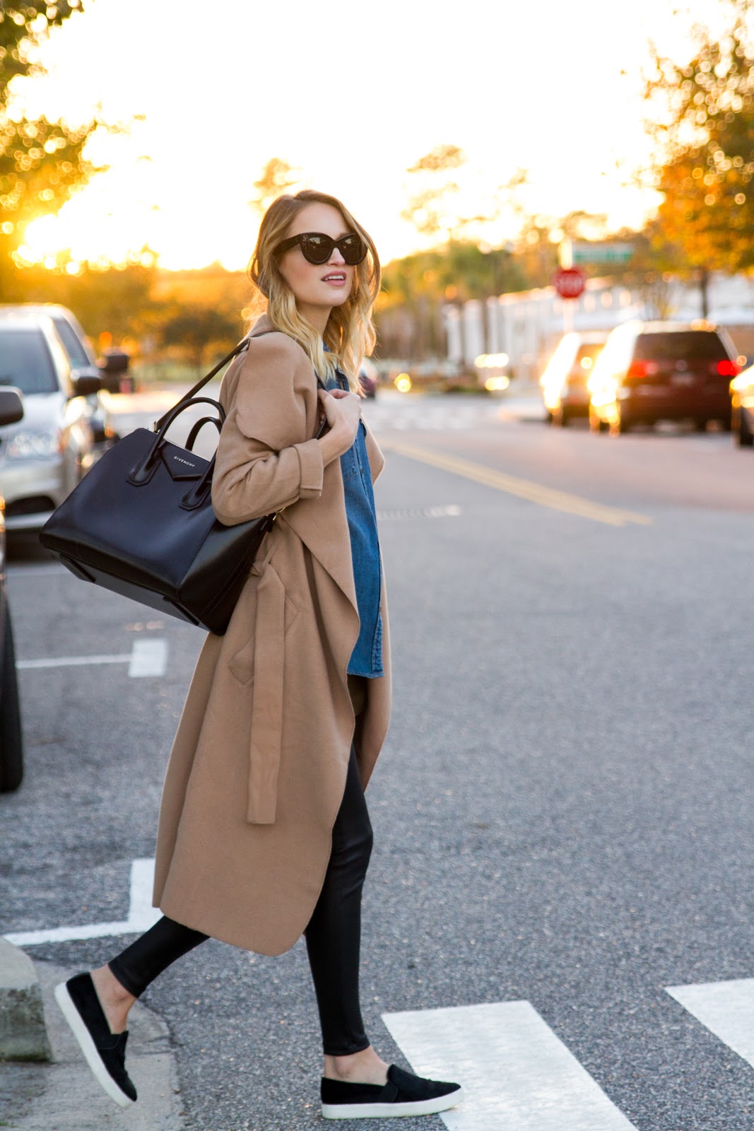 Camel wrap coat $51 | Gap denim shirt (30% off reg price styles!) | Express scuba leggings | Vince Slip on sneakers (I went down a half size!) | Givenchy handbag | Celine sunglasses , similar style here