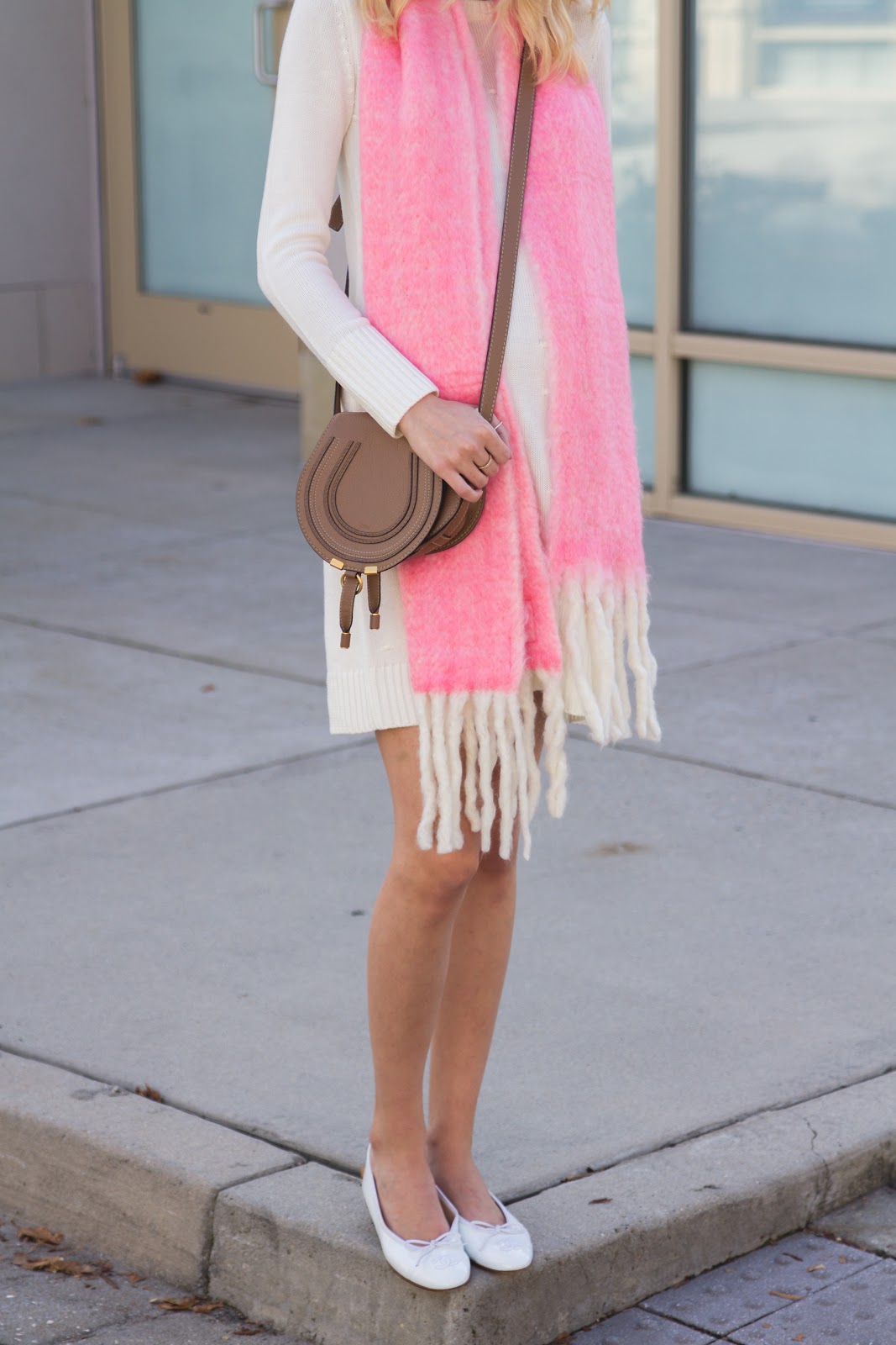 Shift Sweater Dress (only $58!) | Anthropologie scarf (available in other colors!) | Fendi Sunglasses | Chloe cross-body bag | Lakeview ring set | Chanel flats