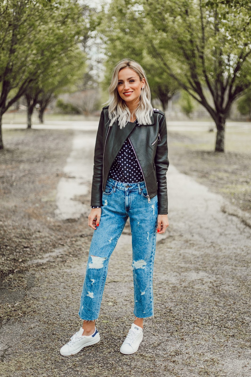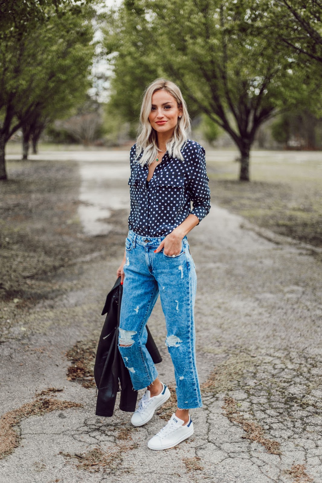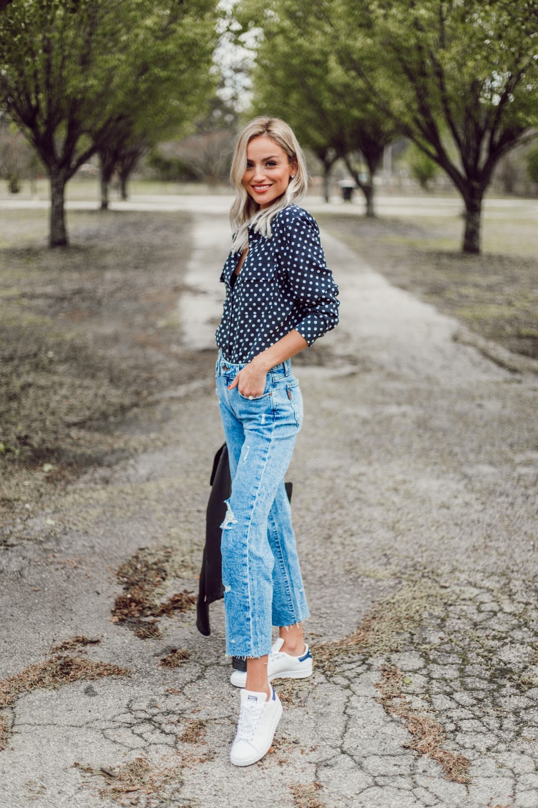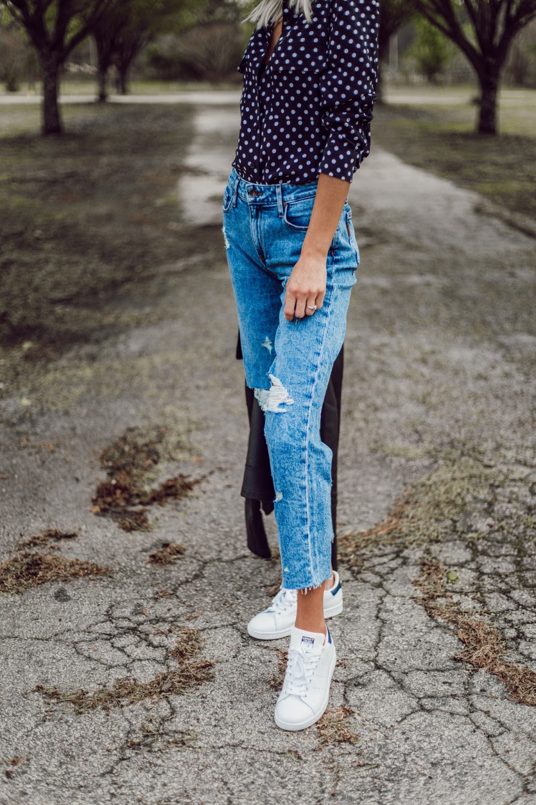 Then the other day, a lightbulb lit up in my brain and I remembered how much I loved my boyfriend style denim. They are perfect to style with a blouse and pop over a jacket for the chilly moments. You guys know I like to keep things more casual so I styled my Paige denim with my adidas sneakers and my favorite polka dot blouse (again). Sorry, I can’t stop wearing this top. I love it dressed up and dressed down with these jeans and sneaks! Technically, this pair of denim was named a straight leg, but in my opinion they fit more like a boyfriend jean. I’m wearing my usual denim size, but could have sized down for a closer fit.
