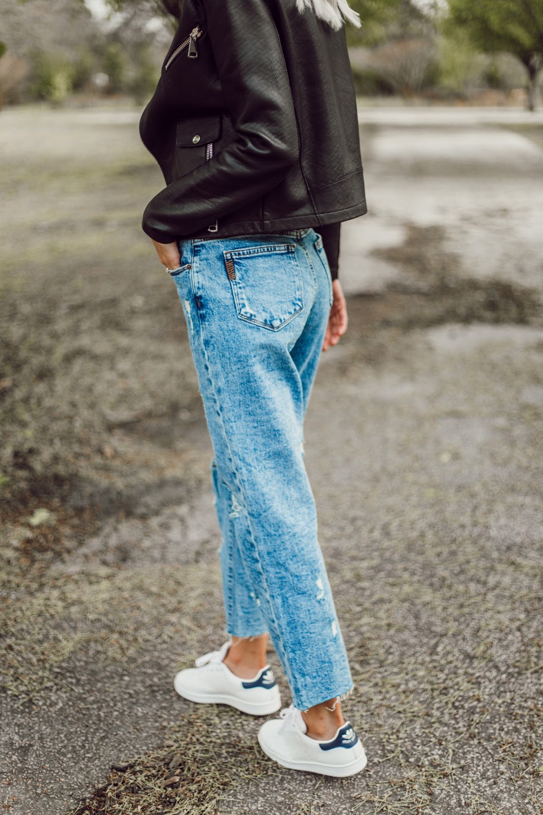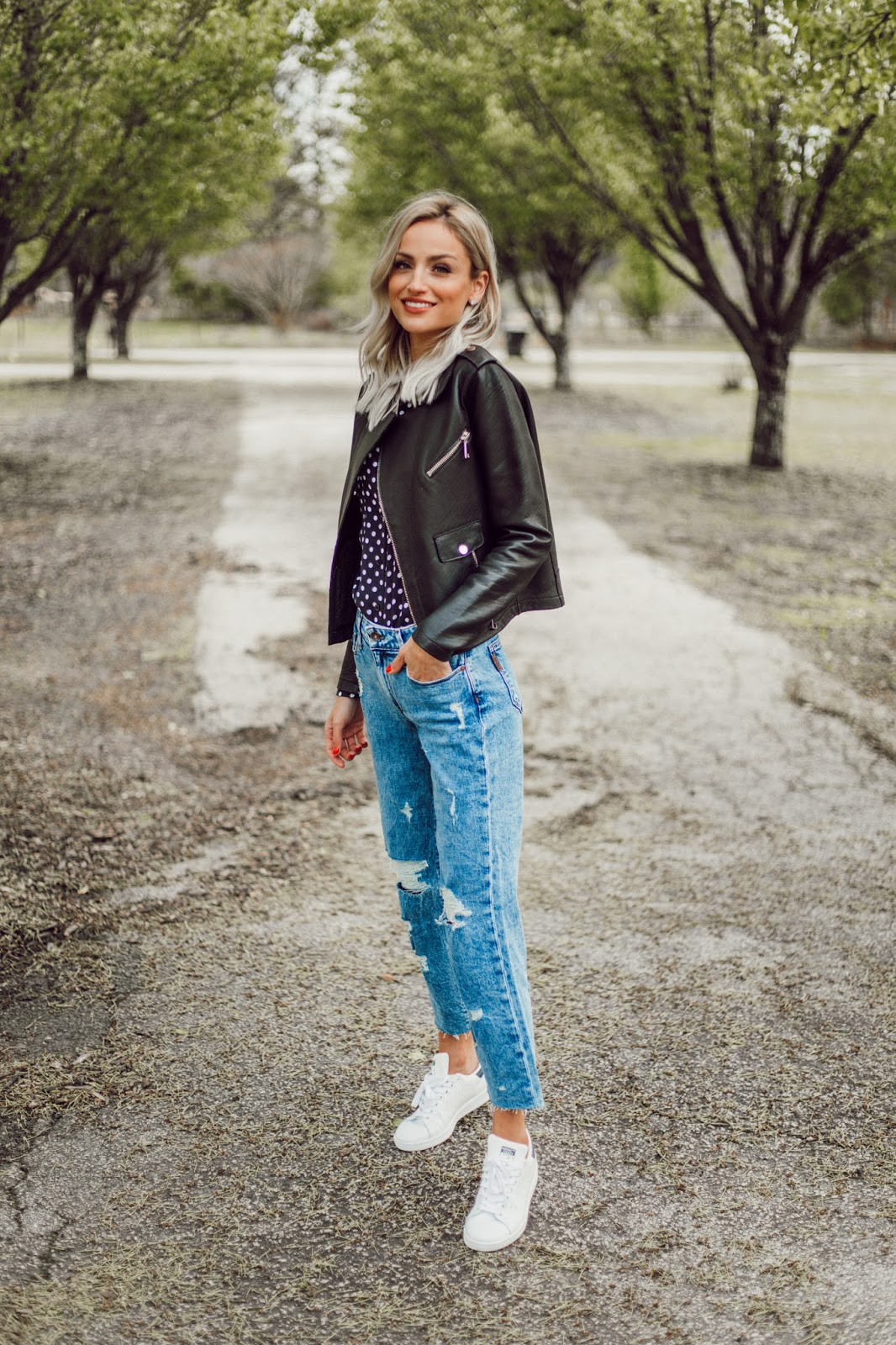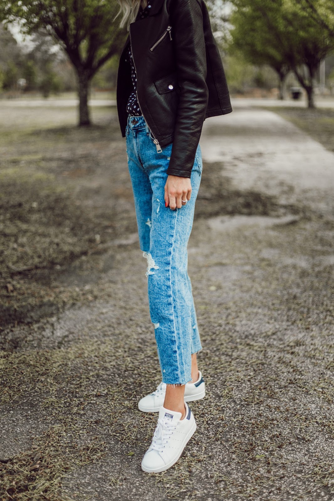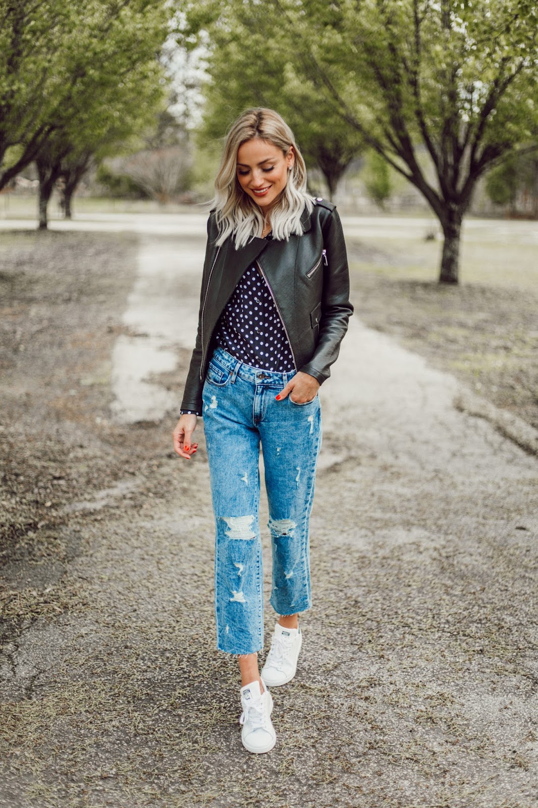 Then the other day, a lightbulb lit up in my brain and I remembered how much I loved my boyfriend style denim. They are perfect to style with a blouse and pop over a jacket for the chilly moments. You guys know I like to keep things more casual so I styled my Paige denim with my adidas sneakers and my favorite polka dot blouse (again). Sorry, I can’t stop wearing this top. I love it dressed up and dressed down with these jeans and sneaks! Technically, this pair of denim was named a straight leg, but in my opinion they fit more like a boyfriend jean. I’m wearing my usual denim size, but could have sized down for a closer fit.