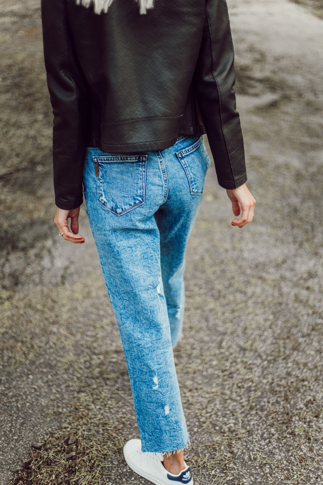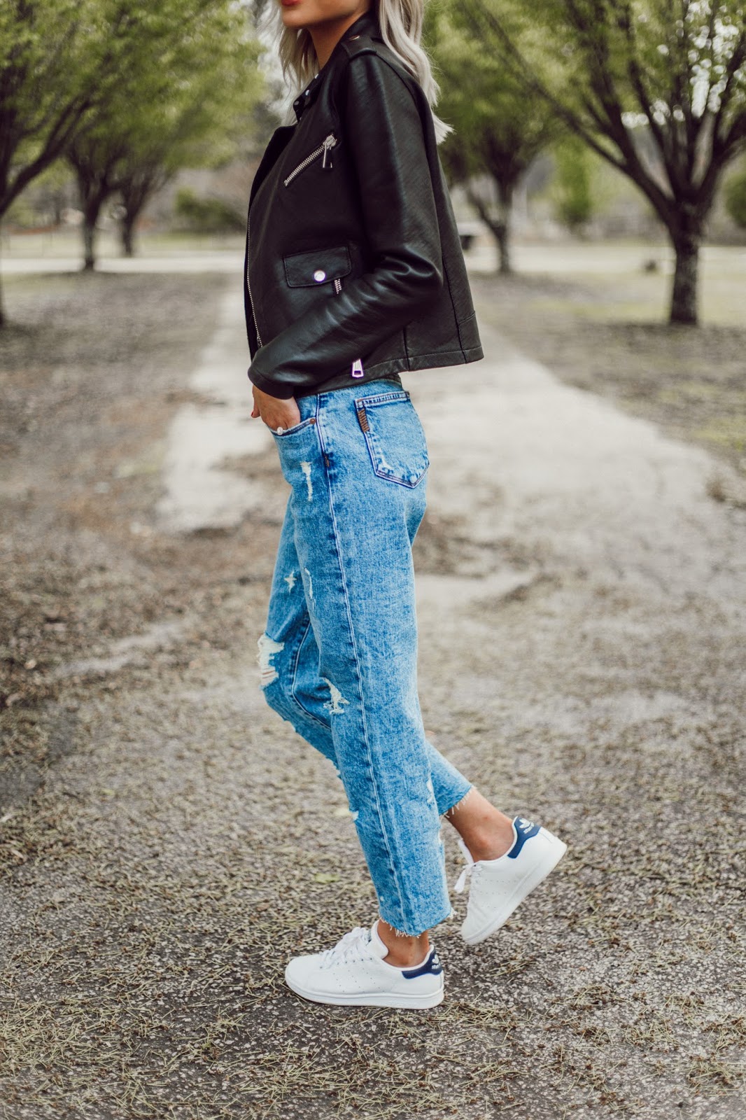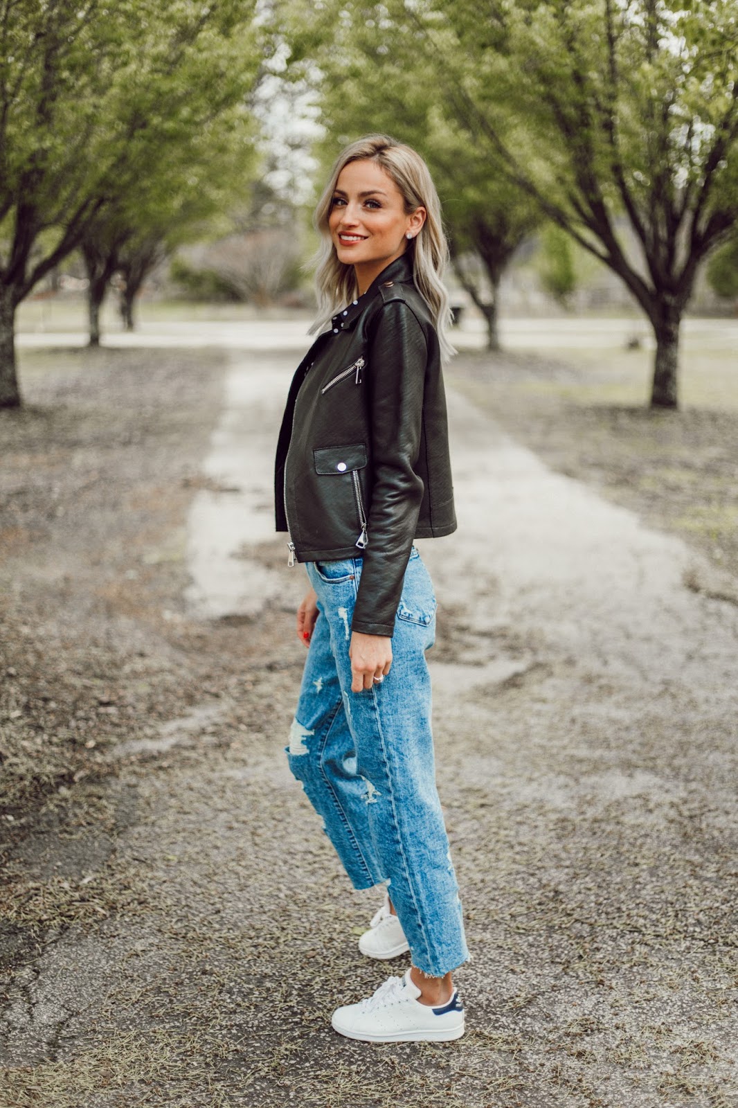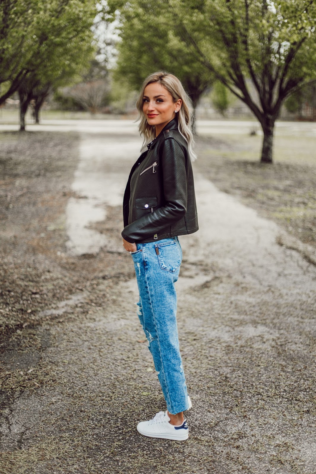 Equipment blouse \ Paige denim \ Adidas sneakers \ Maje leather jacket purchased in-store at Bloomingdales