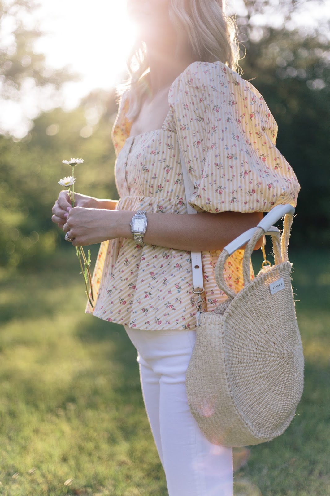 Wearing – Petersyn blouse, JBrand jeans (I sized down 1 size!), Carrie Forbes sandals, Clare Vivier handbag
